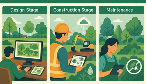 施工阶段:运用物联网技术和智能监控平台,对施工现场进行实时监控和管理,确保施工进度、质量和安全。同时,采用智能灌溉系统和土壤调节技术,保障植物健康生长。